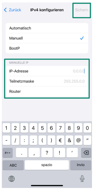 5. Geben Sie die neue IP-Adresse, die Subnet-Maske sowie die Router-Adresse ein. Tippen Sie auf Speichern.