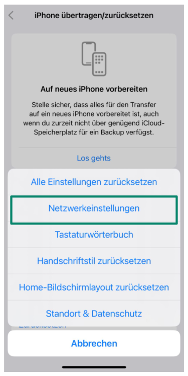 4. Wählen Sie Netzwerkeinstellungen zurücksetzen. Ihr iPhone wird sich neu starten und Ihre Netzwerkeinstellungen werden zurückgesetzt.