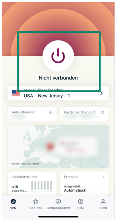 2. Öffnen Sie die App und tippen auf den Einschaltknopf, um sich zu verbinden.