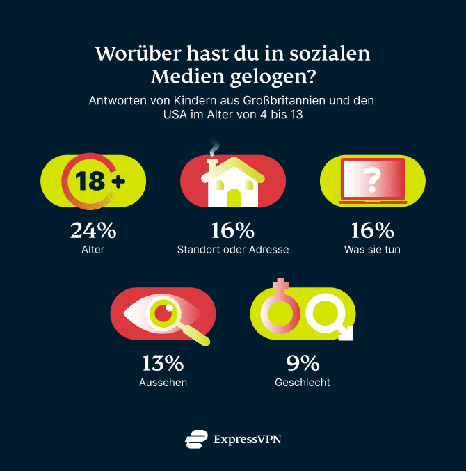 Es überrascht nicht, dass einige der befragten Kinder (24 %) zugaben, in den sozialen Medien über ihr Alter zu lügen, da der Zugang zu sozialen Netzwerken für Kinder unter 13 Jahren verboten ist.