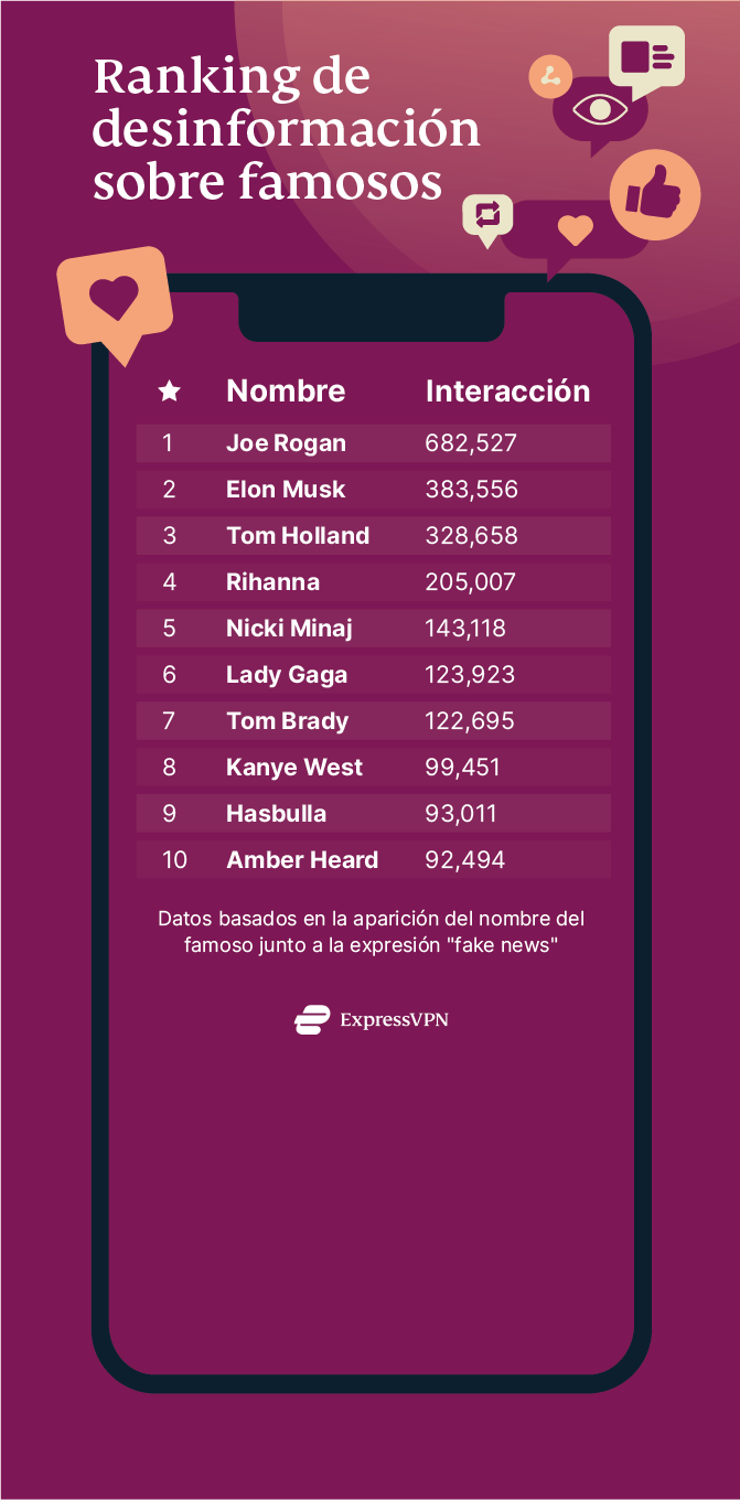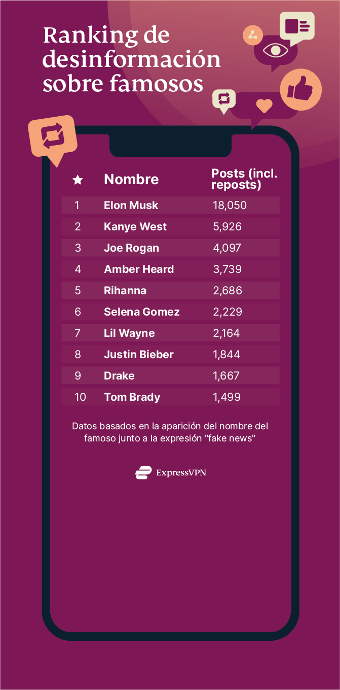 Primero identificamos los nombres de los famosos más buscados online, y después utilizamos datos de escucha de redes sociales para determinar con cuánta frecuencia se mencionaban sus nombres (en redes sociales, foros y comentarios) junto a la frase "noticias falsas", desde enero hasta octubre de 2022. A continuación, clasificamos a los famosos de acuerdo con diversos factores, como la cantidad de publicaciones, impresiones, alcance e interacciones.