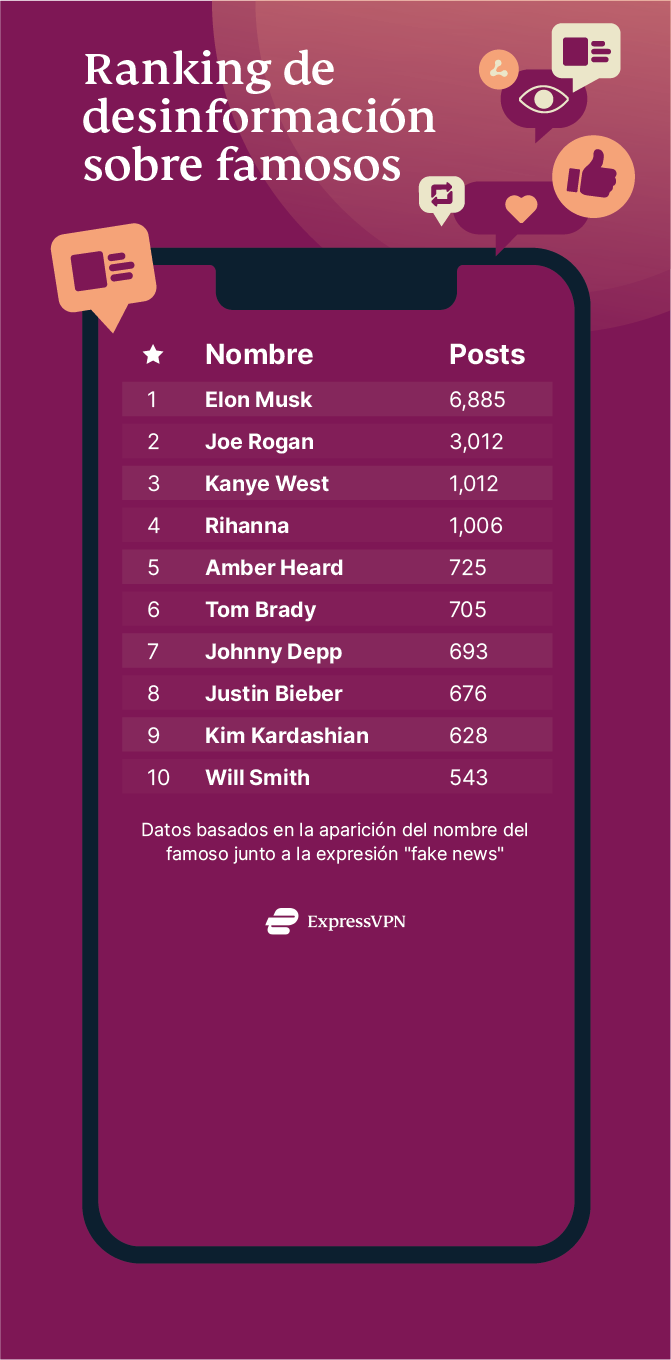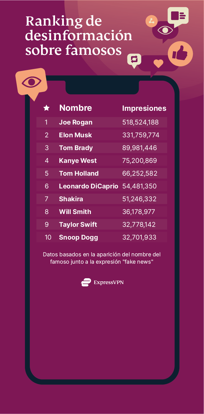 El actor Will Smith y las cantantes Rihanna y Taylor Swift ocupan los últimos tres lugares en nuestro top 10. La bofetada de Smith a Chris Rock en los premios Oscar o el nacimiento del primogénito de Rihanna probablemente fueron las fuentes de inspiración para falsas informaciones, o al menos generaron gran cantidad de preguntas. Mientras tanto, Swift mantuvo su posición como (seguramente) la mayor estrella pop del mundo, recibiendo un aluvión de críticas de todos los flancos, ya fuese por usar su jet privado o por si escribe sus propias canciones.