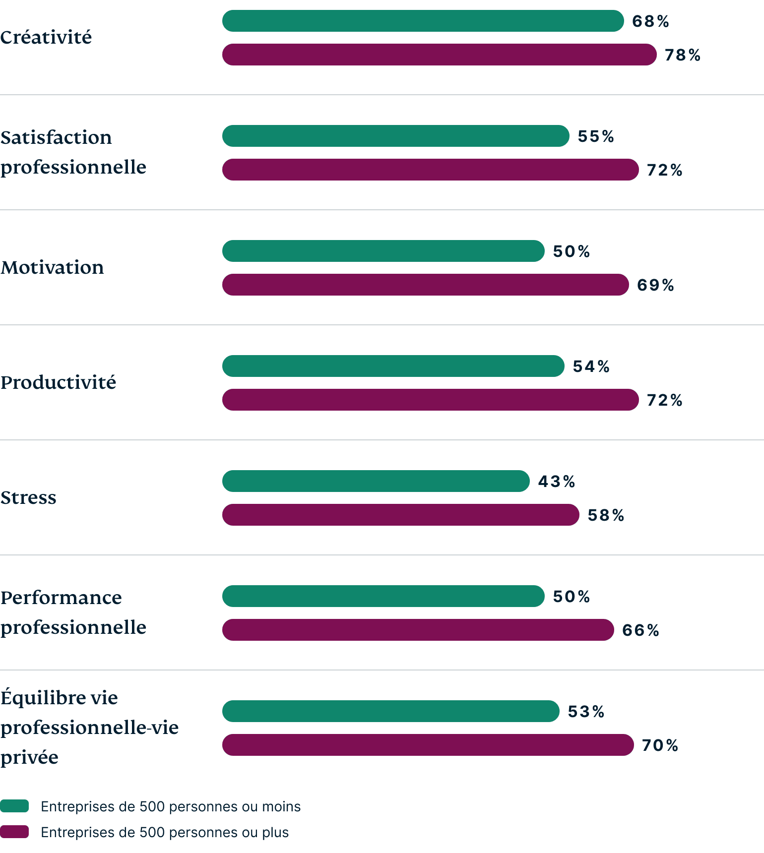 Les employeurs des entreprises de plus de 500 collaborateurs sont les plus intéressés par un environnement de travail immersif, par rapport aux entreprises de moins de 500 collaborateurs. Les salariés des grandes entreprises, en revanche, sont les moins susceptibles de dire qu'ils seraient intéressés par un travail dans le métavers.
