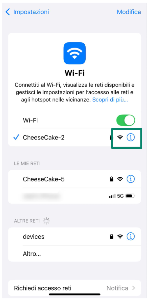 - Individua la rete in uso e tocca la piccola icona (i) accanto al nome della rete.