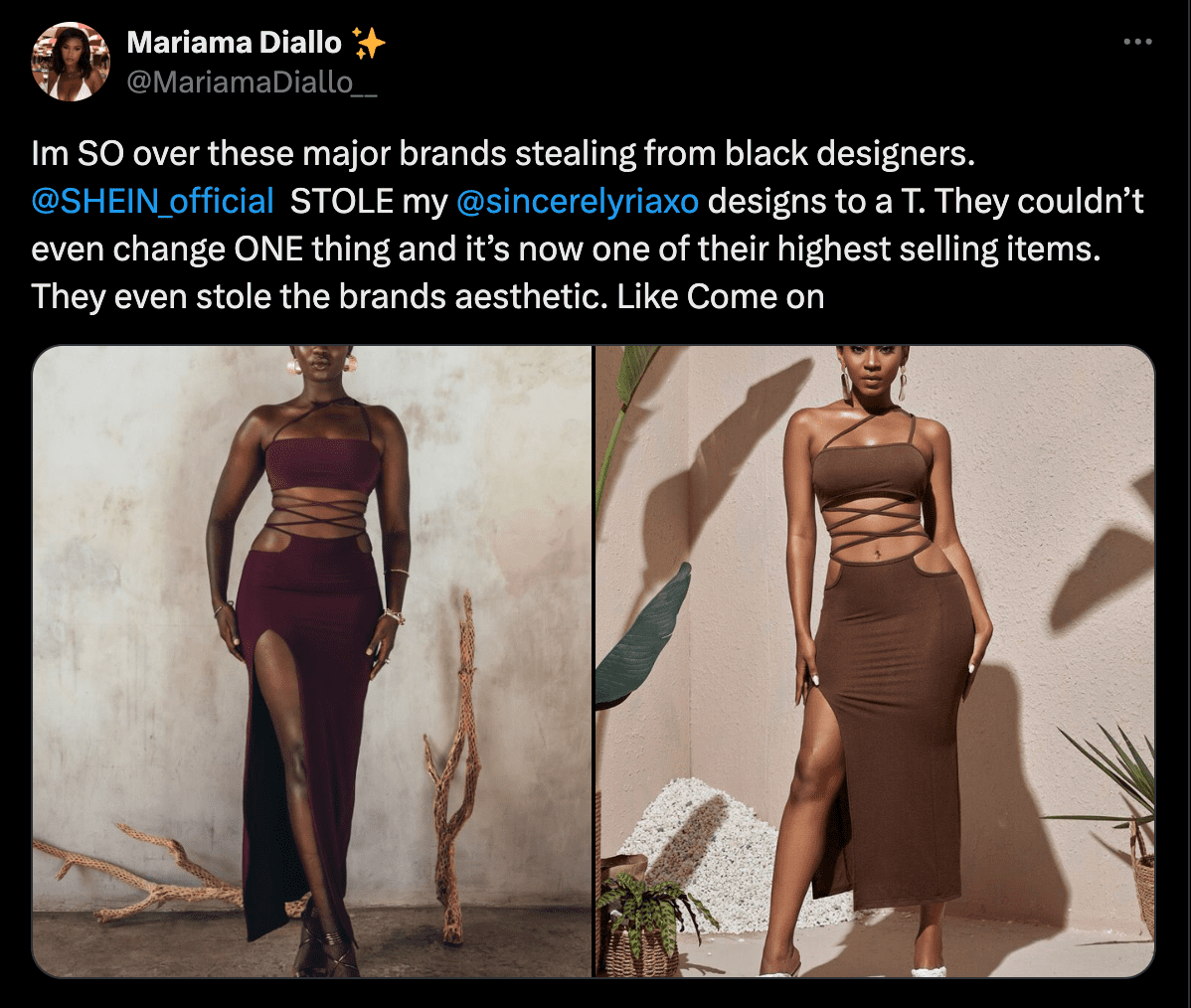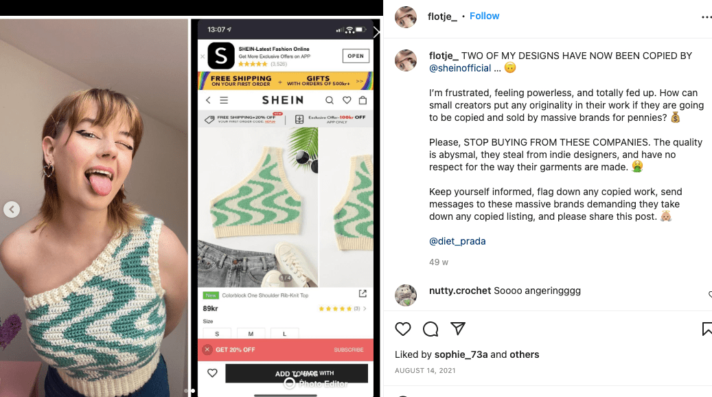 Shein è stato anche accusato di copiare i design di artisti indipendenti e piccole aziende. Numerosi designer hanno affermato pubblicamente che Shein ha riprodotto in massa articoli simili alle loro opere originali senza autorizzazione.