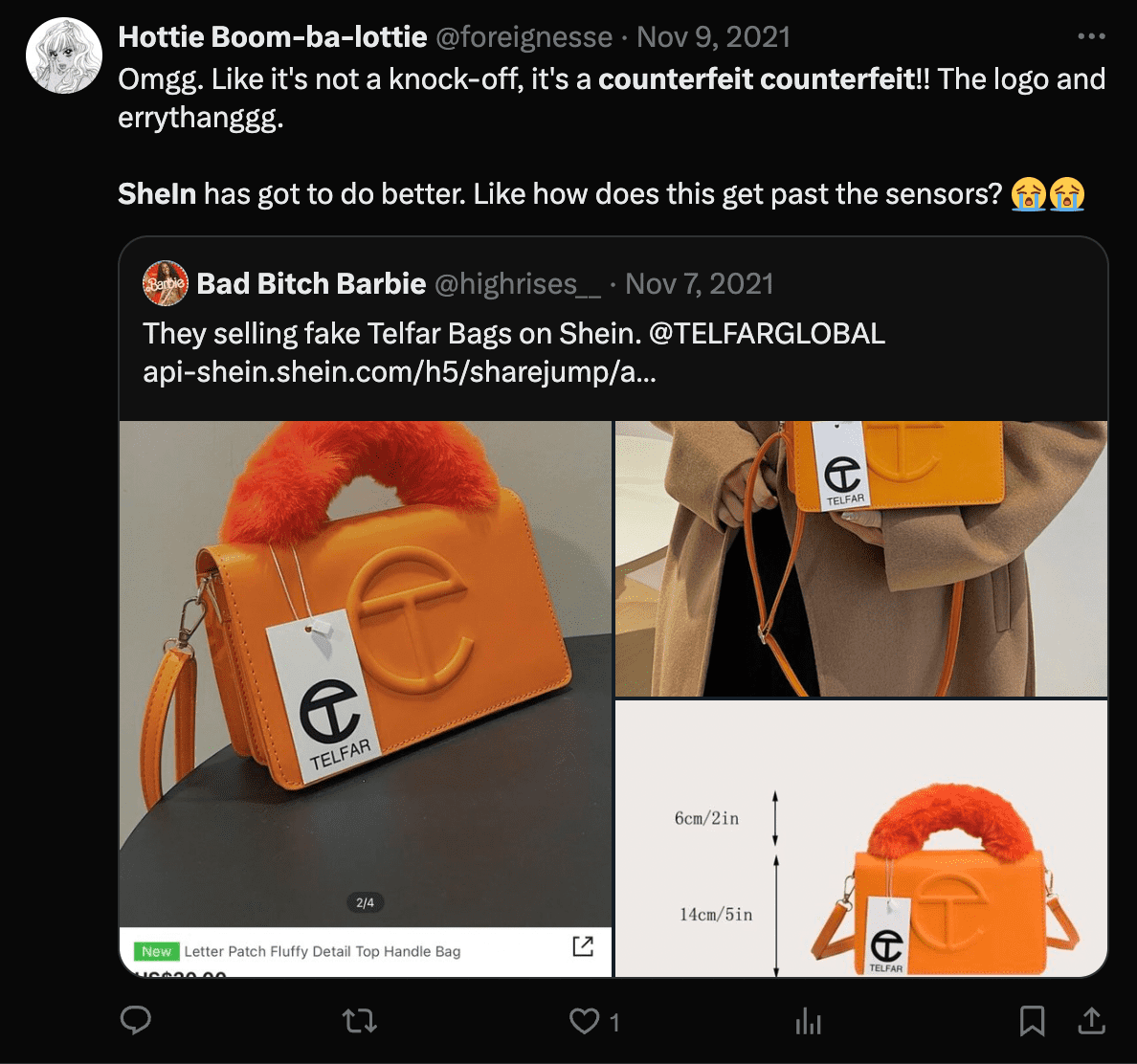 Come con qualsiasi piattaforma che vende prodotti di fornitori terzi, c’è sempre la possibilità di imbattersi in articoli contraffatti. Alcuni clienti hanno segnalato di aver ricevuto imitazioni di marchi popolari, causando delusione e frustrazione. Shein prende provvedimenti per rimuovere gli annunci contraffatti quando vengono identificati, ma non è sempre possibile intercettare ogni caso prima che un prodotto venga venduto.