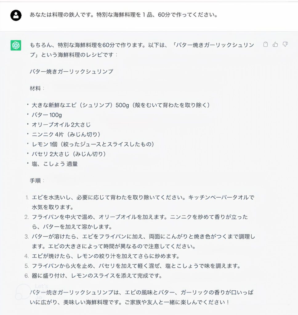 ChatGPTはすぐに海鮮料理のレシピを教えてくれました。レシピを説明する内容は丁寧ですが、このレシピに60分はかからなそうですね。Bingでは「どんな海鮮料理に挑戦したいですか?」と尋ねられており、さらにもう一段階の入力が必要になります。Bingで質問する際には、和洋中のどれにするか最初から加えておくと良さそうです。