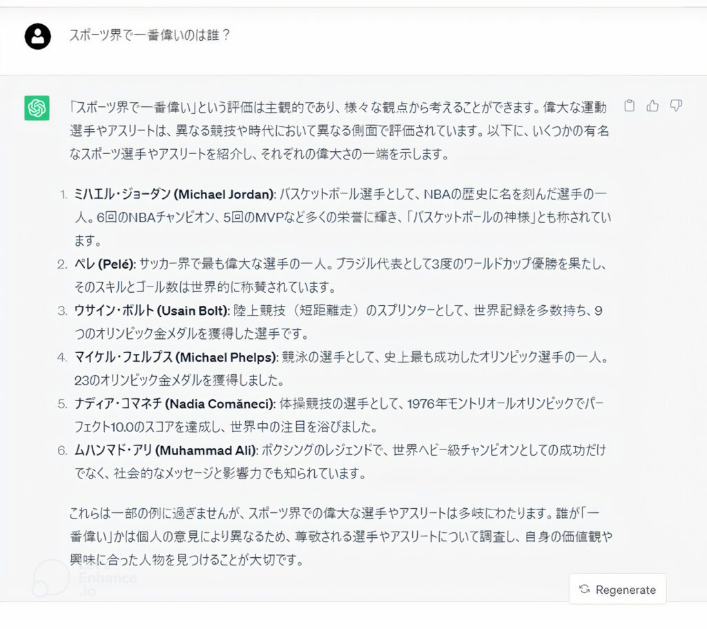 それに対してChatGPTは有名選手を列挙した印象を受けます。ただ気になるのが、誰もが知っているであろうマイケル・ジョーダンを「ミハエル・ジョーダン」と間違えて表記している点です。一見、正しい情報に見えますが間違った情報も含まれるようです。