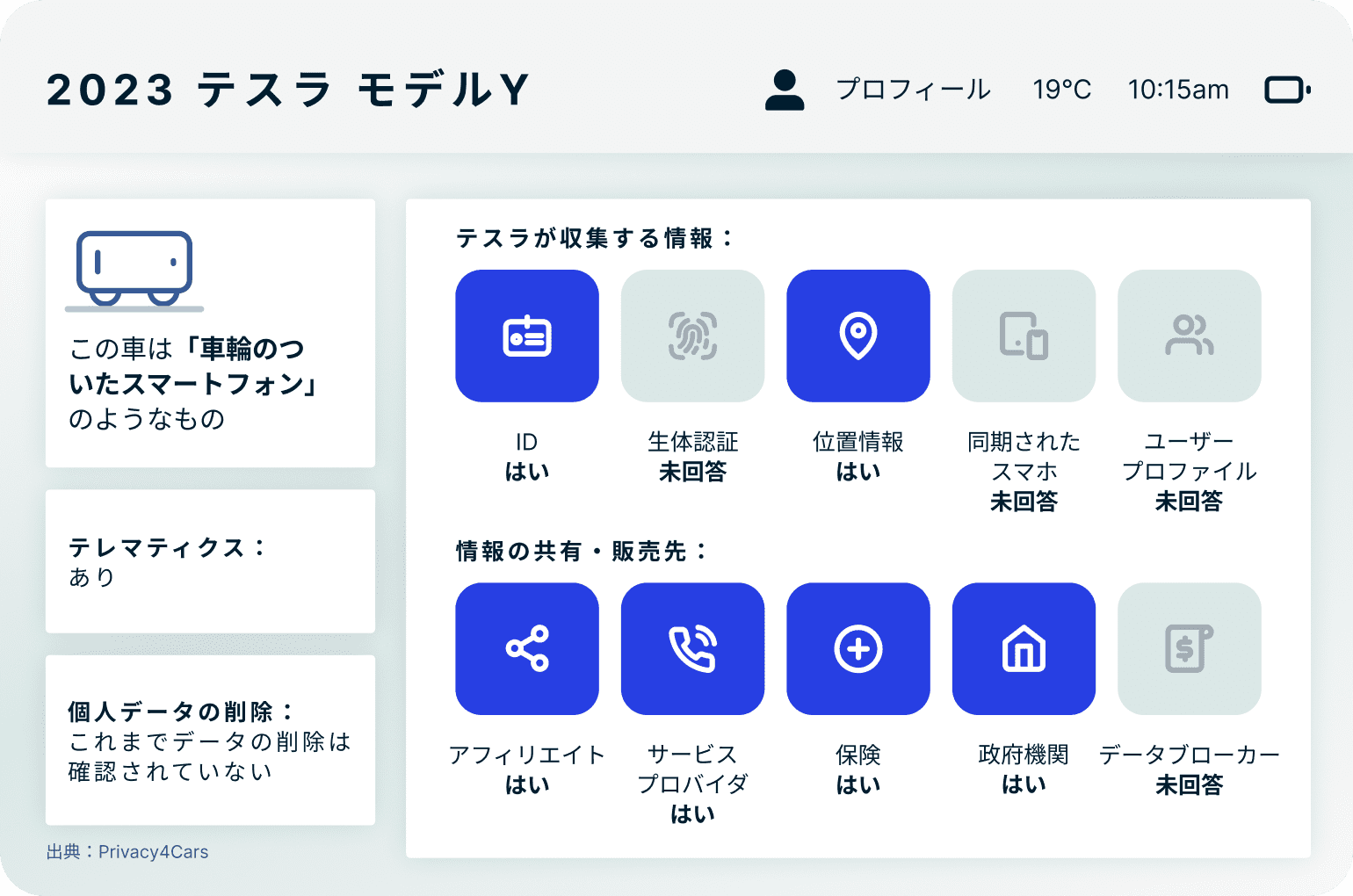 「現代の自動車は膨大な量のデータを収集し、車載やクラウドに無期限に保存しています。データは車だけでなく、その乗員も追跡します。位置情報履歴、電話内容(連絡先、メール、テキストメッセージ、ツイート、ソーシャルメディアのフィード)、音声記録、体重、その他の生体認証データが記録されます。異様に誇張して聞こえるかもしれませんが、実際にそうなのです。多くの場合、車のデータはドライバーではなく、メーカーの利益のために収集されます。