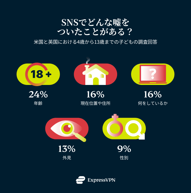 約6人に1人の子どもが、「SNSで住所や居場所、尋ねられたときに何をやっていたか、自分の外見や容姿について偽ったことがある」と回答しています。子どもが嘘をつく理由についてまでは尋ねていませんが、SNS上で居住地や行動、容姿を偽る子どもがいるということは、ネット上で、見知らぬ人から自分を守る必要を感じていることを示唆しています。また、彼らが社会に適合すること、非現実的な社会基準を満たすこと、または承認を求めることに対するプレッシャー、つまりソーシャルメディアによって増幅されるプレッシャーに対応していることを示唆している可能性もあります。時間が経つにつれて、この行動は彼らの自尊心と精神的健康に潜在的に害を及ぼす可能性があります。