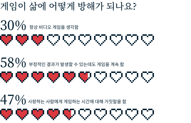 게임 세계 밖에서 즐거움을 찾을 수 없는 상황은 비디오 게임에 대한 집착으로 이어질 수 있고 먹기, 사회 활동, 잠자기, 일하기와 같은 필수적인 일상 활동을 무시하게 될 수 있습니다. 걱정스럽게도, 응답자의 절반 이상이 비디오 게임이 일상 생활에 부정적인 영향을 미칠 수 있다는 사실을 알고 있는데도 불구하고 비디오 게임을 계속하는 경우가 많다고 답했습니다.