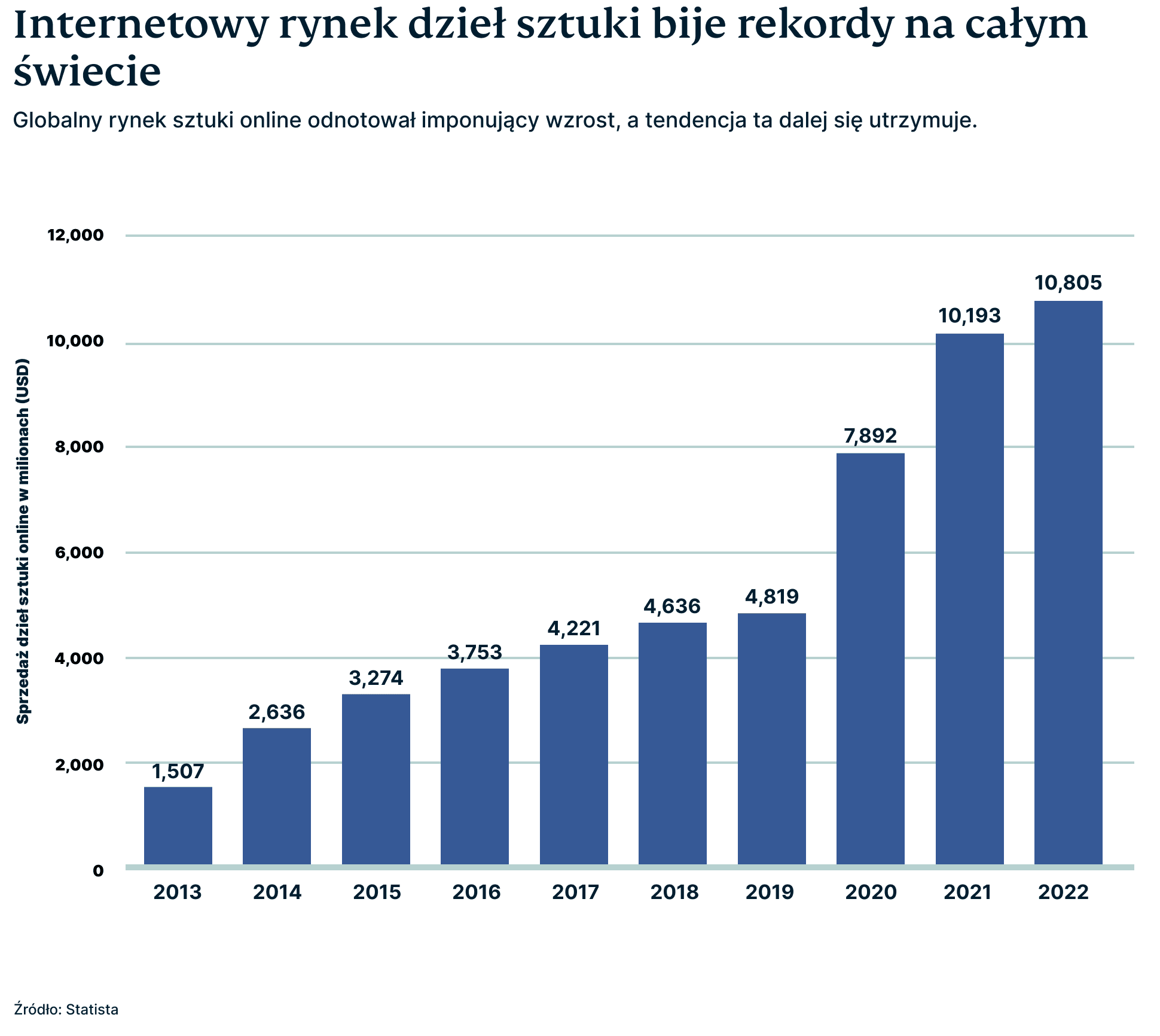 Inwestowanie w dzieła sztuki również może być opłacalnym sposobem na dywersyfikację portfela i generowanie wysokich zwrotów. W samym 2022 r. dzieła sztuki osiągnęły lepsze wyniki niż inne typy aktywów inwestycyjnych, odnotowując imponujący wzrost o 29%. Sprzedaż dzieł sztuki wygenerowała również oszałamiającą wartość 10,8 mld USD dzięki transakjcom online.
