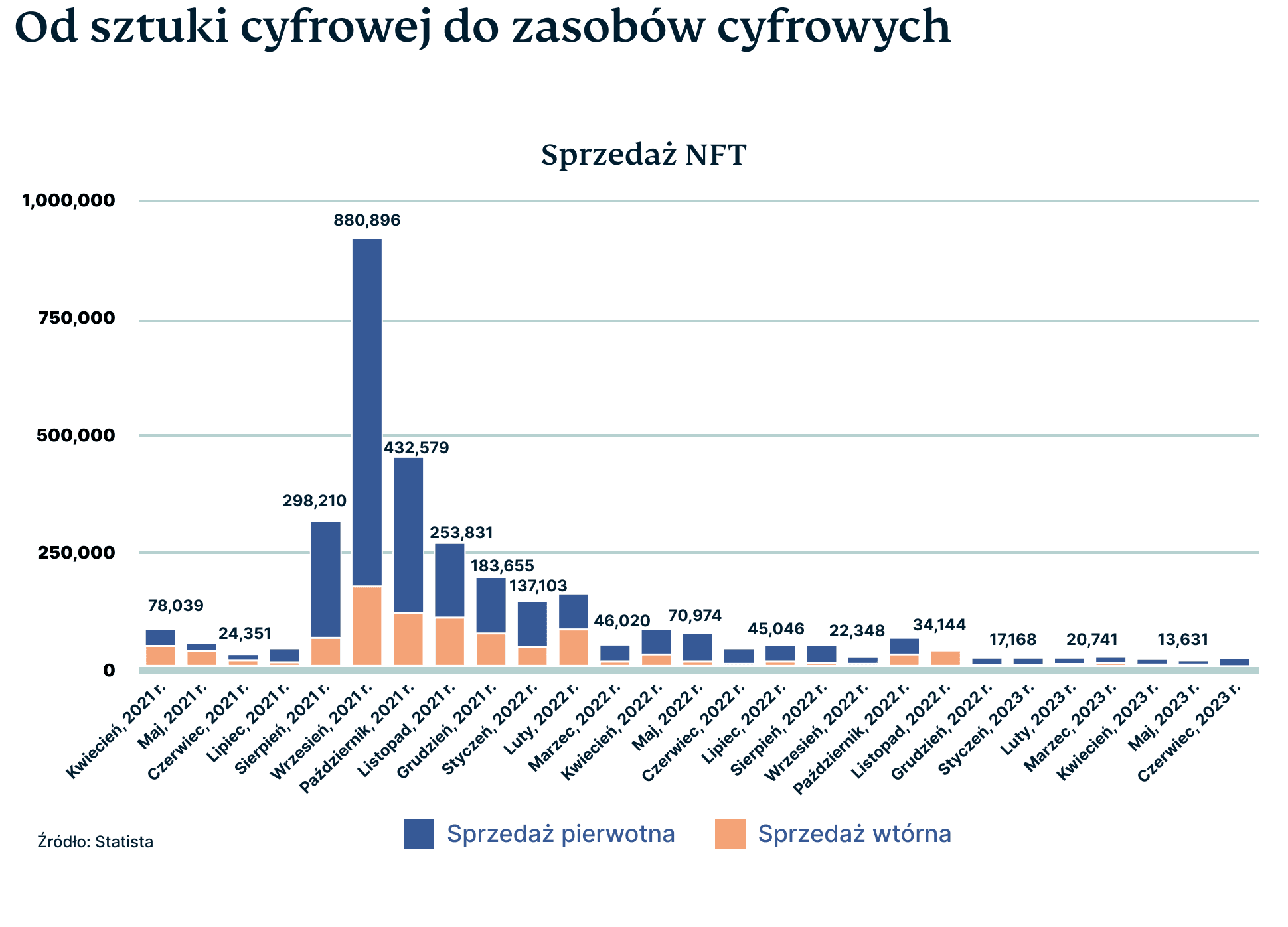 Do spadku rynku NFT przyczyniło się kilka czynników. Jednym z tych istotniejszych jest osłabienie początkowego szumu wokół NFT, co doprowadziło wiele osób do przyjęcia bardziej sceptycznego stanowiska wobec tej technologii. Poniższy wykres ilustruje spadkową trajektorię sprzedaży NFT od kwietnia 2021 r. do czerwca 2023 r.
