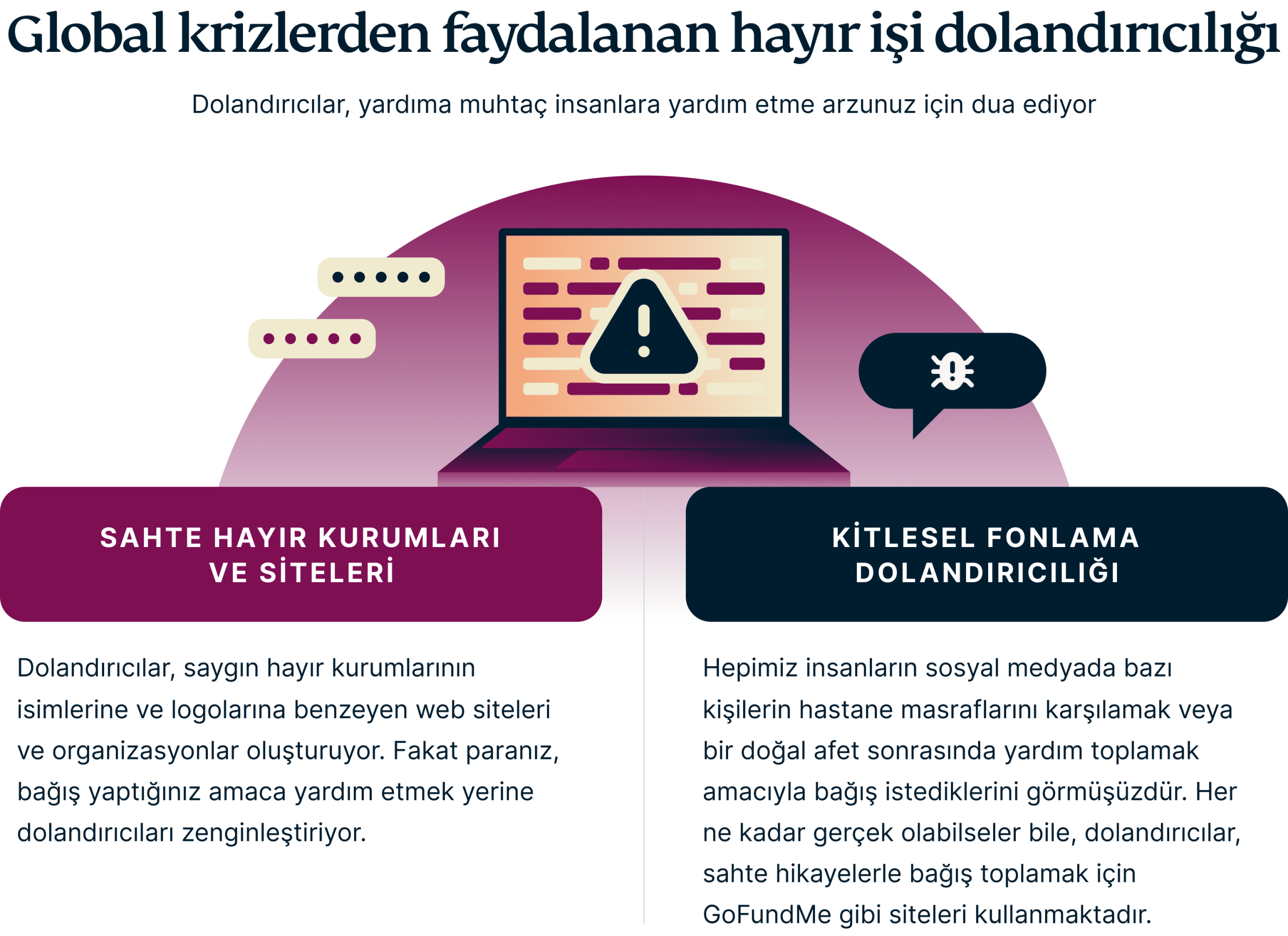 Doğal afetler ve insani acil durumlar gibi küresel krizler, yardım için güçlü bir arzuyu uyandırıyor. Dolandırıcılar ise kendi çıkarları için bu arzuyu suistimal ediyor ve bağış çabalarıymış gibi görünen bir düzenbazlık ağı örüyor.