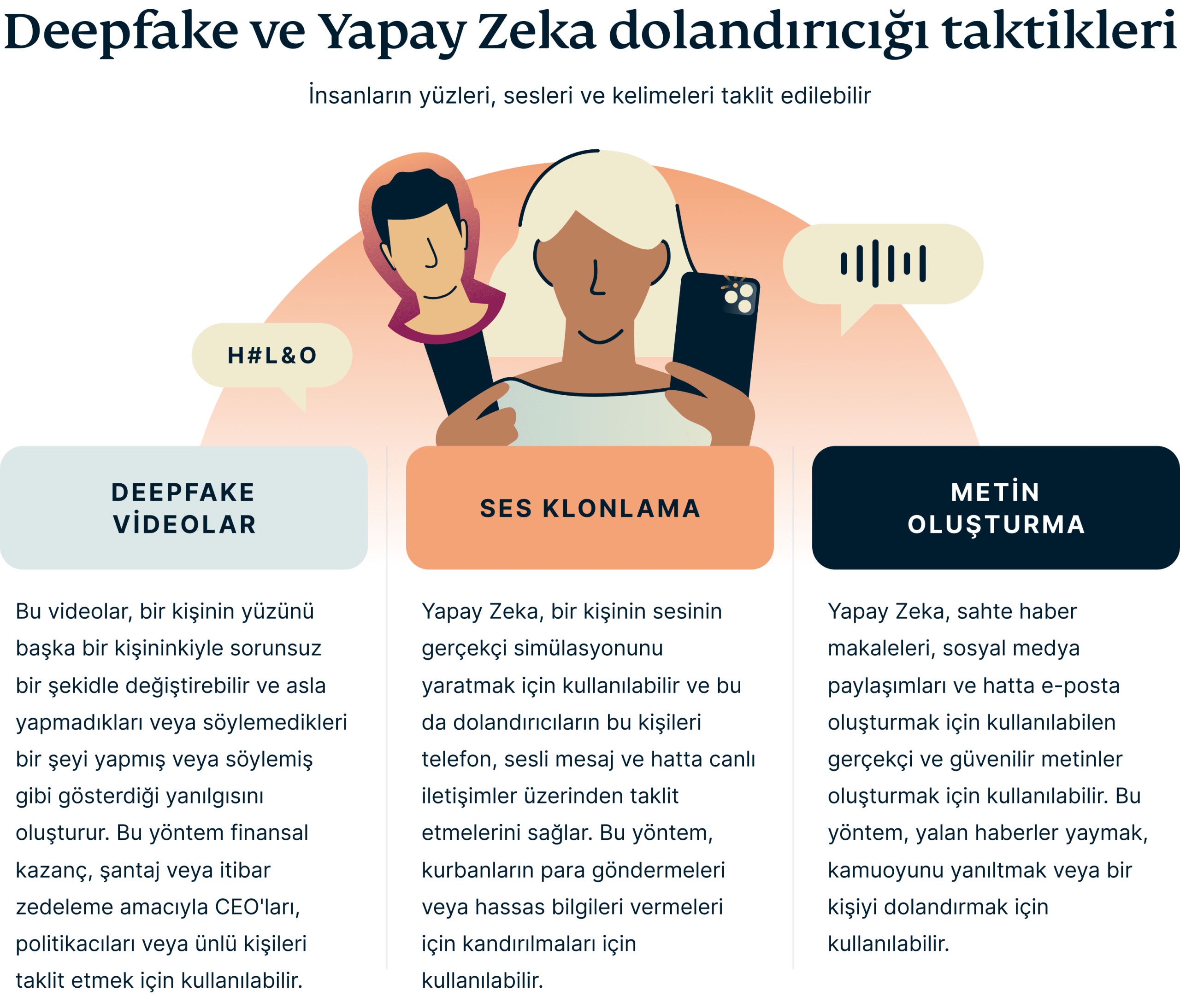 Yapay Zeka’nın kötü şöhretli bir uygulaması olan deepfake, oldukça gerçekçi videolar, fotoğraflar ve ses kayıtları oluşturulmasına olanak tanıyor. Bankanızın yöneticisini taklit eden birinden bir videolu arama aldığınız ve hesap bilgilerinizi istediği, veya parasal yardım isteyen bir yakınınızdan sesli mesaj aldığınız bir senaryoyu düşünün. New York Times tarafından haber yapılan önemli bir örnek, yüksek gelirli bireylerin herkese açık ses kayıtlarından örnek alınarak oluşturulan ses klonlarının kullanıldığı saldırılarda nasıl hedef alındığını ortaya koydu. Klonlanan bu sesler, bankaları dolandırmak için kullanıldı ve bu durum da bu tür dolandırıcılıklarda kullanılan yüksek seviye teknolojiyi sergiliyor.