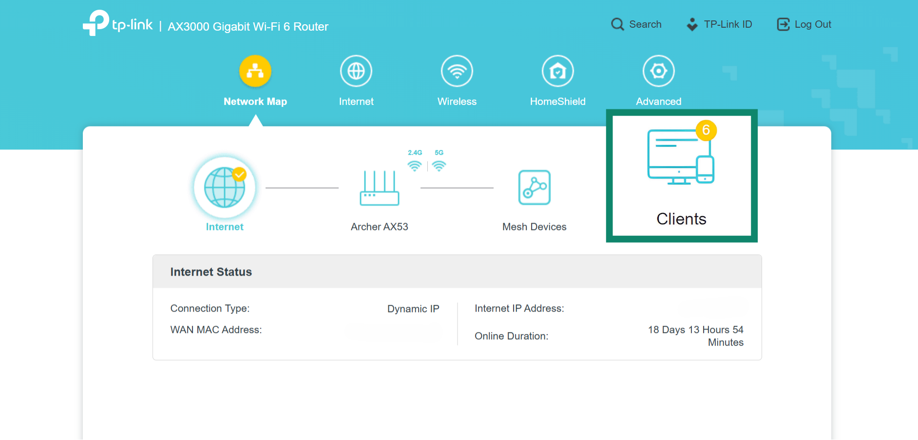 - Once inside, check for the Clients, Connected Devices, or Attached Devices options.