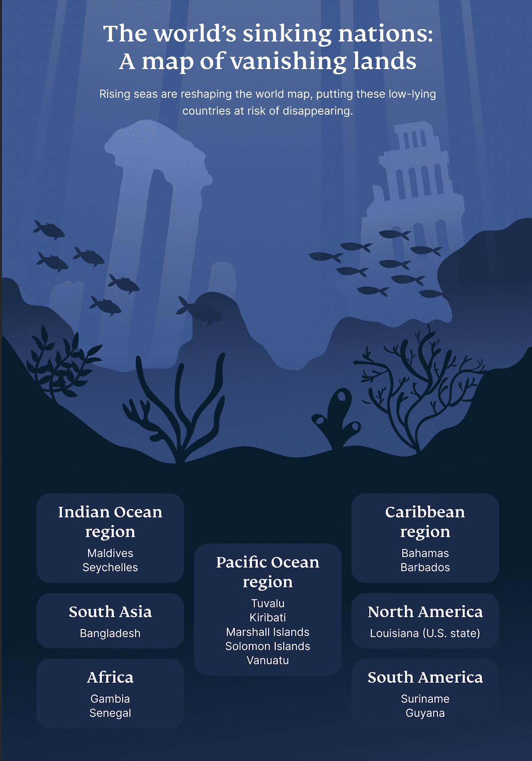 For many coastal and island regions, the ocean has always been a source of life—fueling economies, shaping cultures, and connecting communities. But now, it threatens to take it all away. Countries like Tuvalu, the Maldives, and Kiribati are among the most vulnerable. But they’re not alone. Across the globe, low-lying areas—from atolls in the Pacific and Indian Oceans to parts of Bangladesh and Louisiana—are facing the risk of disappearing beneath the waves.