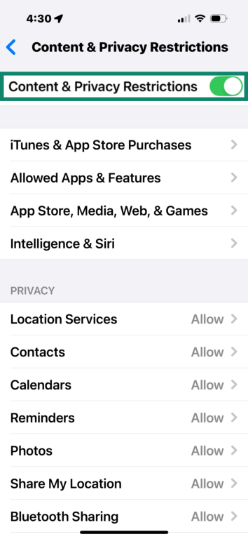 Screen Time settings with Content & Privacy Restrictions highlighted.