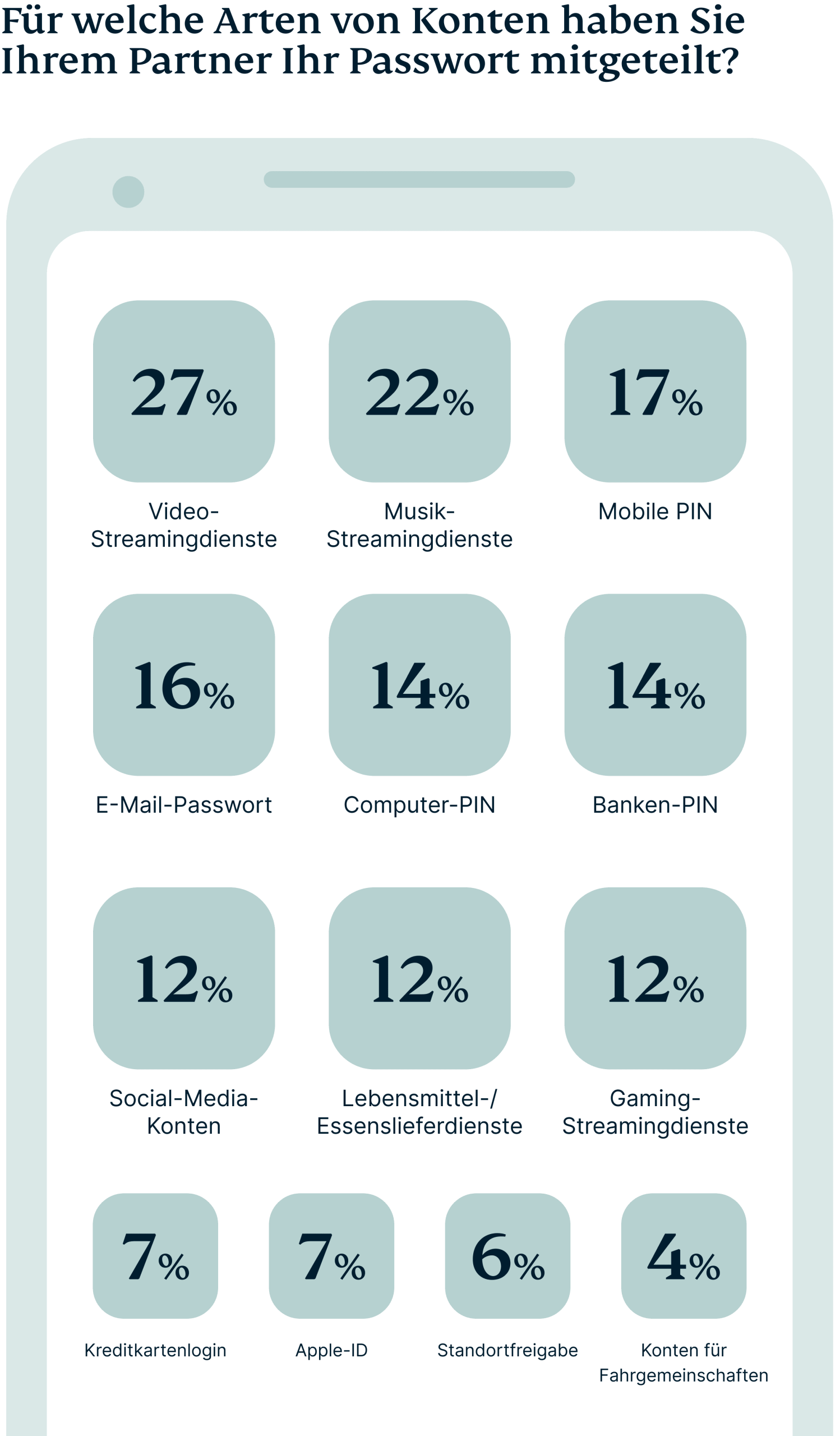 Die gemeinsame Nutzung von Passwörtern ist in Beziehungen weit verbreitet: 45 % der Deutschen geben an, ein Passwort mit ihrem Partner geteilt zu haben.