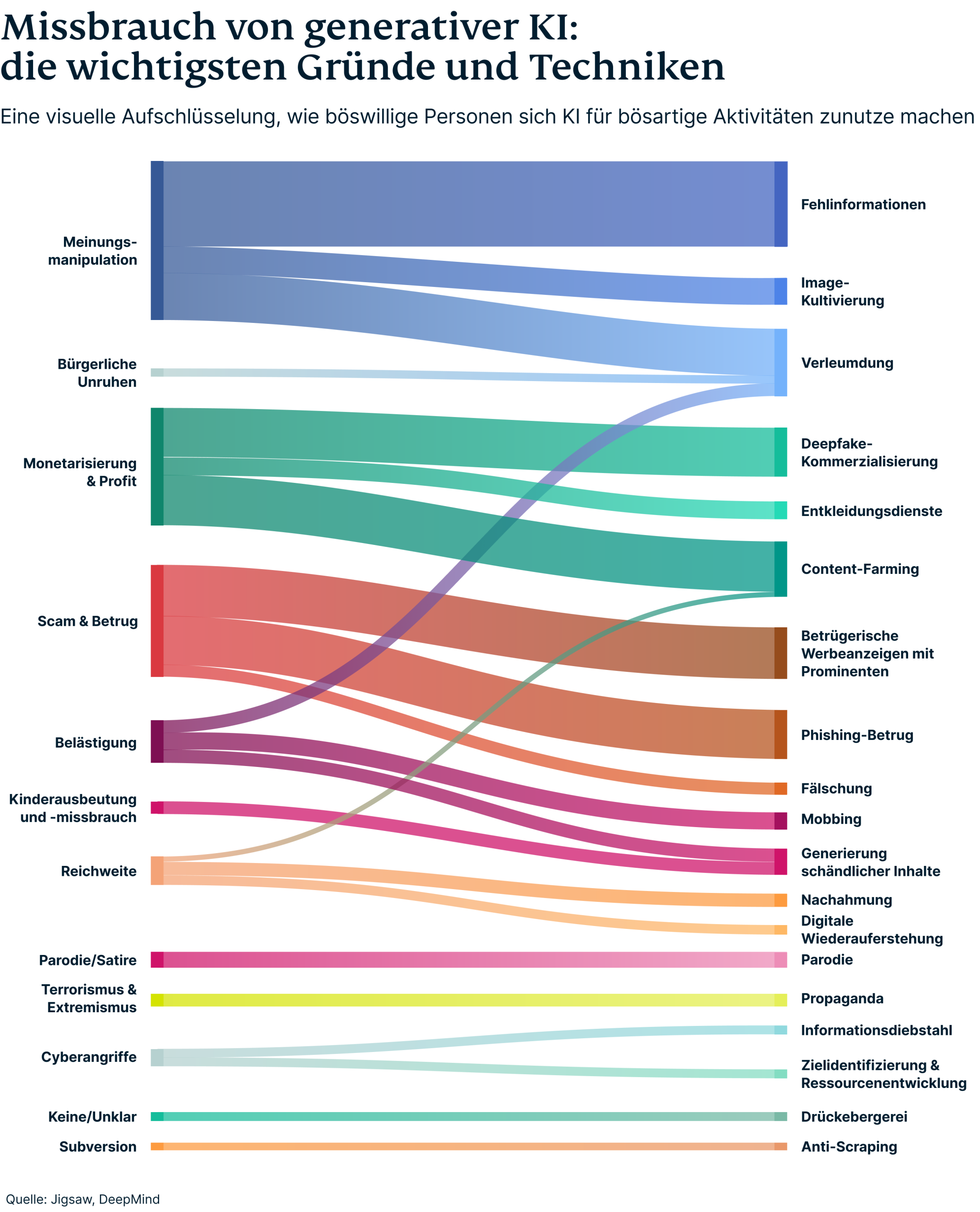 Eine kürzlich von Google DeepMind durchgeführte Studie ergab, dass die Beeinflussung der öffentlichen Meinung das häufigste böswillige Ziel der Nutzung generativer KI ist, vor allem durch Deepfake-Medien. Die Erstellung realistischer, aber gefälschter Bilder, Videos und Audios von Menschen war fast doppelt so häufig wie der nächsthäufigste Missbrauch von generativen KI-Tools, nämlich die Erstellung von textbasierten Fehlinformationen im Internet.