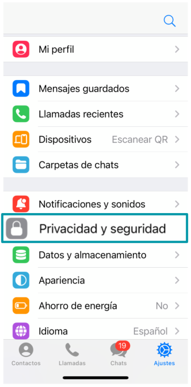 - Pulsa en Privacidad y seguridad. Aquí puedes decidir quién puede ver tu número de teléfono, foto de perfil y estado. Puedes limitar el acceso a Mis contactos en lugar de a Todos para preservar la privacidad de tus datos personales.