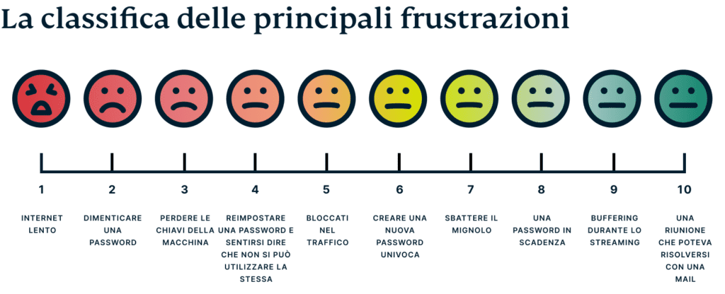 Al contrario, la maggior parte dei partecipanti tedeschi trova più frustrante una connessione internet lenta (34%), perdere le chiavi dell'auto (34%) e stare seduti nel traffico (25%) che dimenticare una password online (19%).