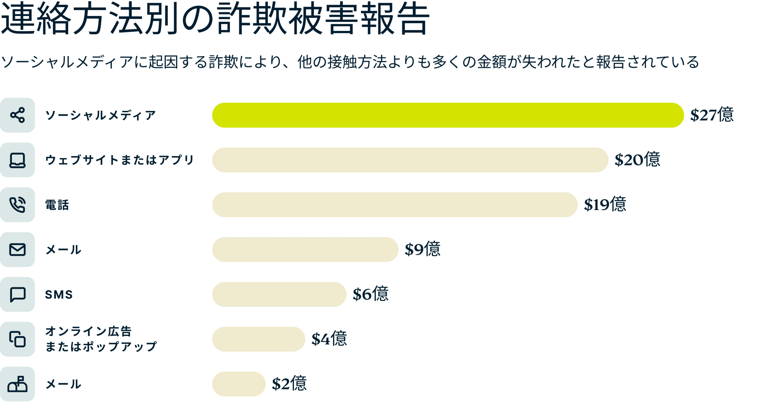 2023年、ソーシャルメディアは詐欺行為の温床となり、米国ではソーシャルメディア詐欺だけで27億米ドルが失われました。詐欺師はこうしたプラットフォームをますます活用するようになっており、信頼と広範なリーチを悪用して、無防備な被害者を陥れています。