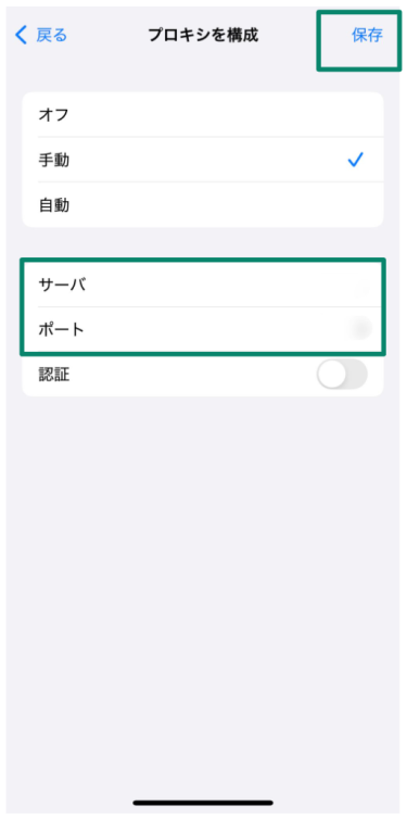 - サービスに提供されたプロキシサーバーのアドレスとポート番号を入力し、保存をタップします。