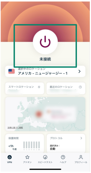 - アプリを開き、電源ボタンをタップすると接続されます。