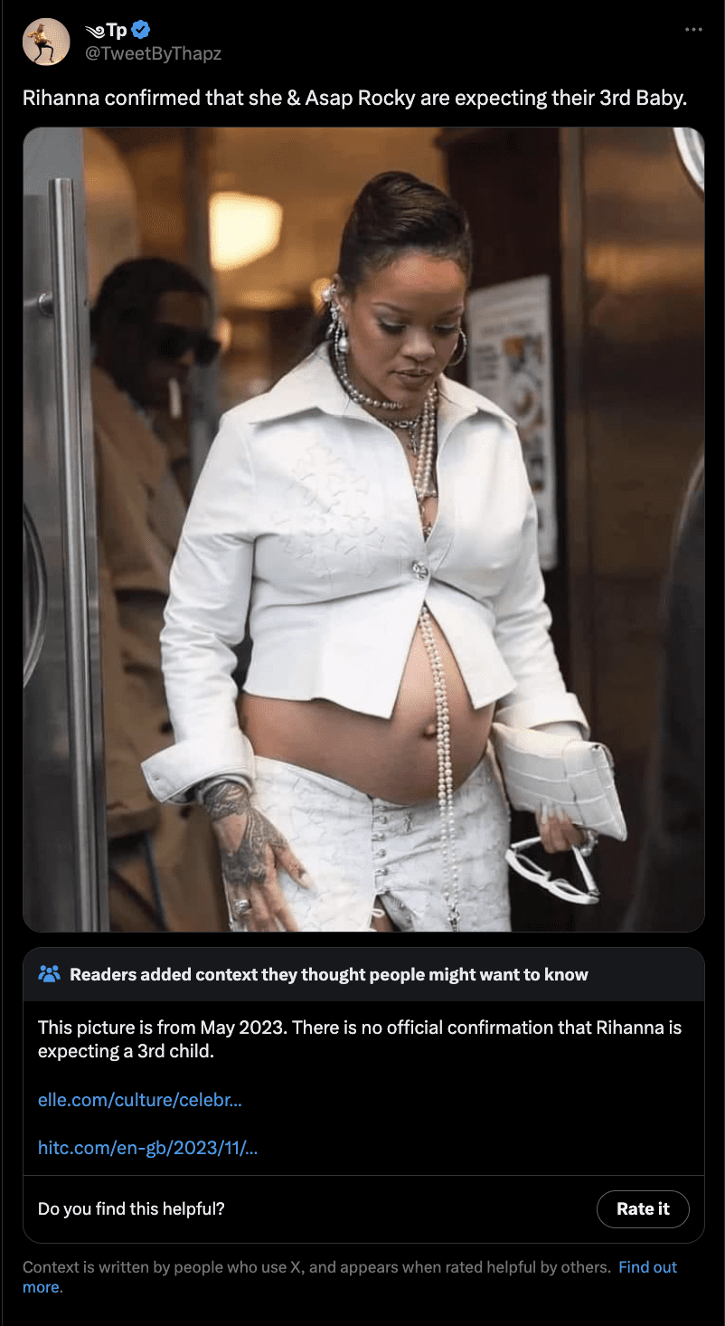リアーナとメーガン・マークルは、今年のフェイク・ベビー・ニュースの中心人物で、フェイクニュース指標の5、6位に位置します。リアーナが第3子を妊娠したと偽ったディープフェイク動画は大きな波紋を呼びました。2023年8月にエイサップ・ロッキーとの間に第2子を出産したにもかかわらず、その直後のベテランズ・デーの週末にまたすぐに出産を控えているという噂が瞬く間に広まりましたが、まったくの事実無根でした。