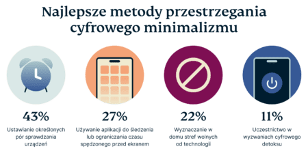 Jednym z popularnych podejść jest ustalanie konkretnych godzin sprawdzania urządzeń. Dla 43% ankietowanych, którzy praktykują cyfrowy minimalizm, oznacza to celowe wyznaczanie okresów pozbawionych cyfrowych rozpraszaczy. Jest to sposób na wspieranie jasności umysłu i zmniejszenie ciągłego chaosu umysłowego, który wynika z ciągłego przebywania online.