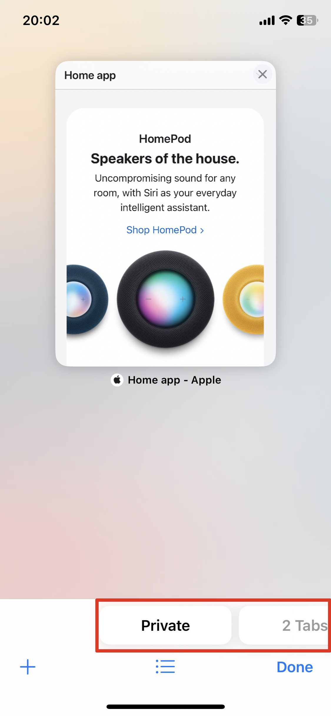 - Agora, você verá as guias que estão abertas. Na parte inferior da tela, você verá um botão indicando o número de guias abertas. Deslize esse botão para a direita ou toque no botão Privado em cinza.