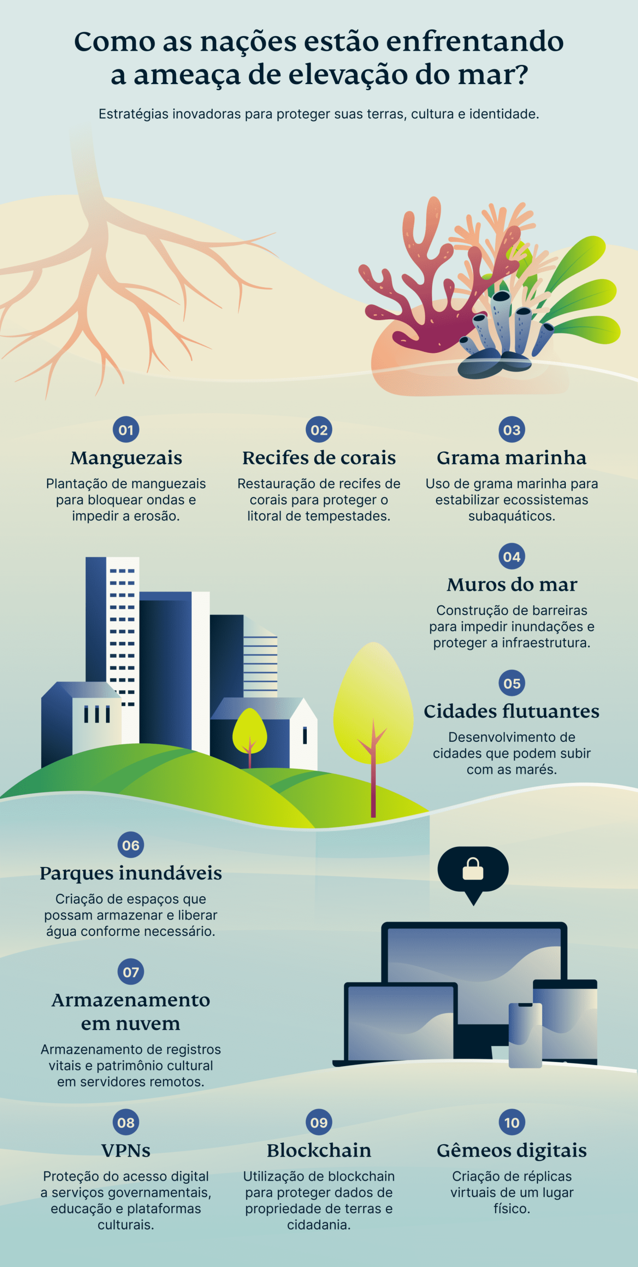 Mas, mesmo enquanto suas terras se desgastam e sua infraestrutura digital enfraquece, essas nações não estão simplesmente assistindo à sua história desaparecer. Pelo contrário, estão reagindo com resiliência extraordinária—investindo tanto em defesas físicas para proteger o que resta quanto em estratégias digitais para garantir que suas identidades perdurem, independentemente do que o futuro traga.