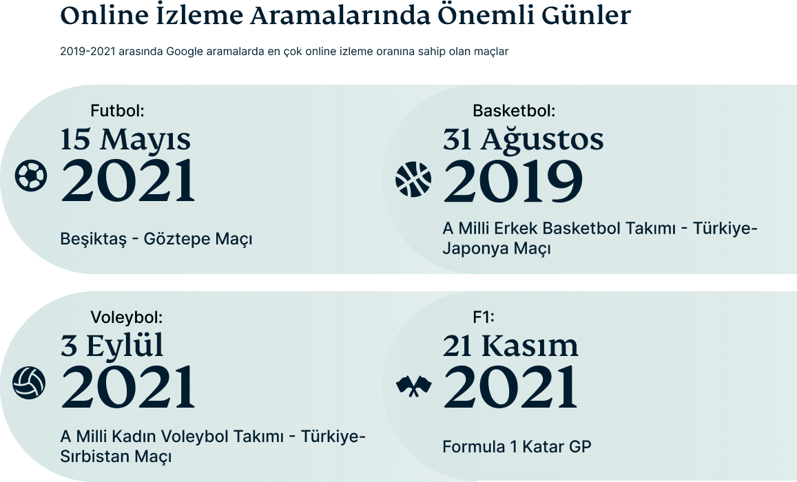 2021’de ise voleybol maçlarına olan ilgide ani bir artış görüyoruz. Aynı yıl içindeki arama oranlarında gerçekleşen artışlar, A Milli Kadın Voleybol Takımının 2020 Tokyo Olimpiyatlarındaki karşılaşmalarına denk geliyor. Filenin Sultanları Tokyo’dan beşinci olarak eve dönmüştü.